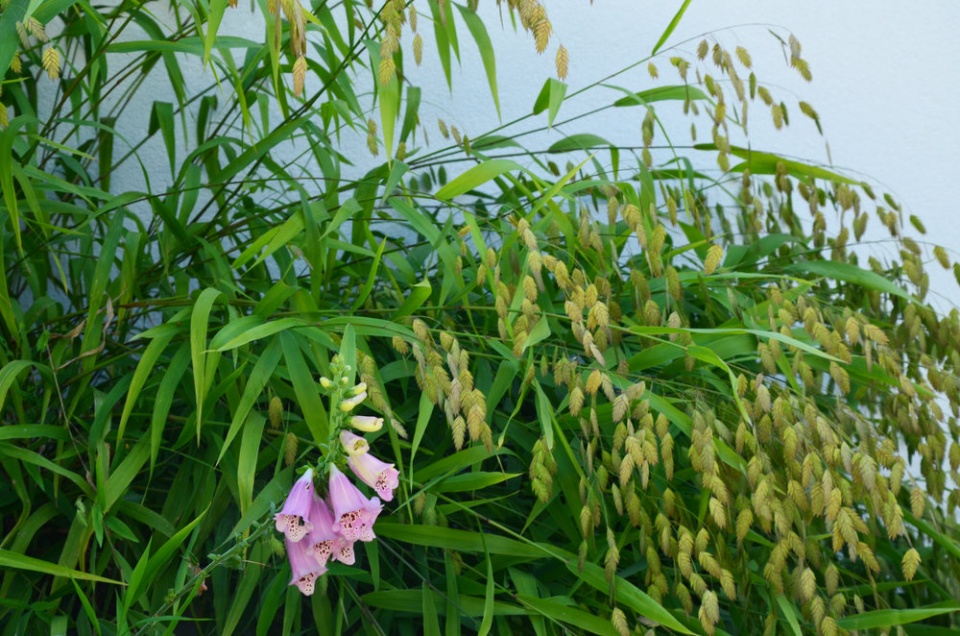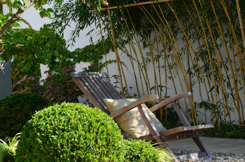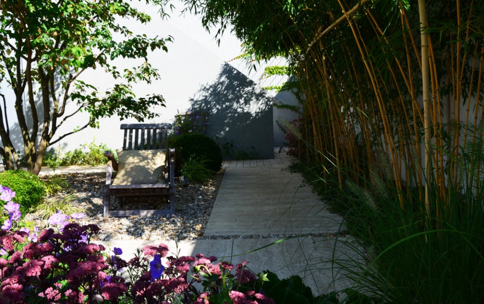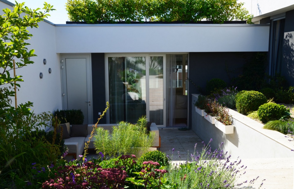 Atrium je dvouúrovňové a průchozí. „Ze dvou stran se nachází okna a či francouzské dveře do obytných místností. Ostatní strohé zdi atria byly vylepšeny pomocí vertikálních bambusových stébel a množstvím popínavek,” ukazuje zahradní architekt.