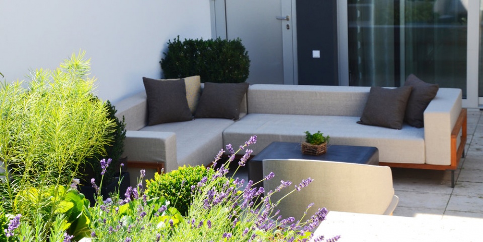 K úplnému pohodlí majitelů zde slouží kvalitní venkovní pohovka, která byla slušivě doplněna o konferenční stolek z betonu.