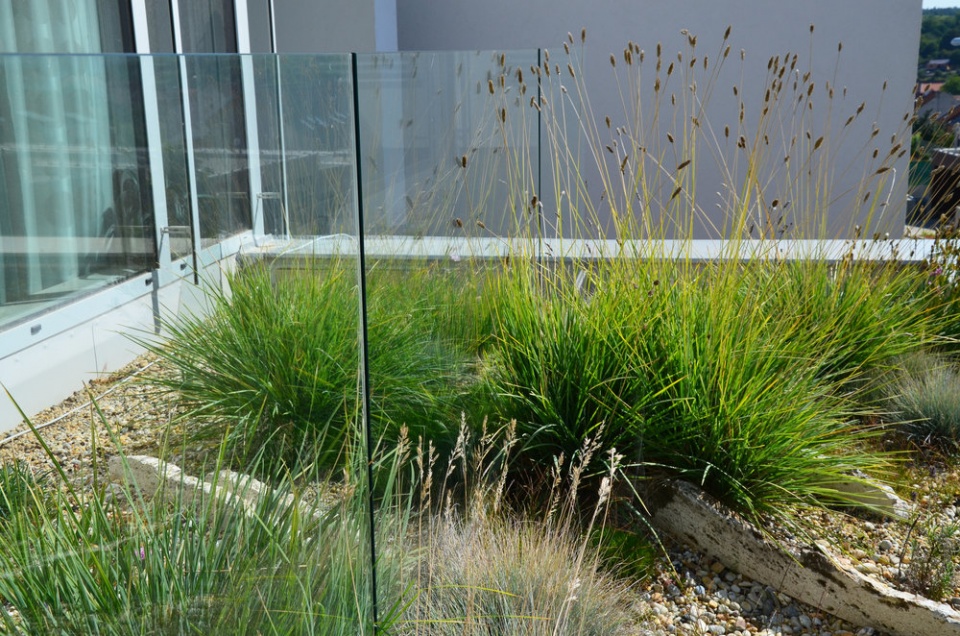 Společně s atriem byl řešen i balkon na opačné straně obývacího pokoje, který na atrium provozně navazuje. Balkon obrácený do ulice je ryze pohledový a obsahově v travertinovém tématu pokračuje. I když jen decentně, kámen je zde zarostlý v suchomilných travinách.