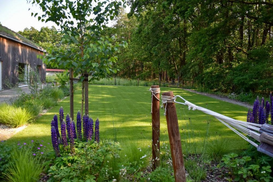 „Z čistě praktických důvodů bylo do zahrady zapotřebí umístit trávník. Ten je přísně formován – žádné přírodní odnikud nikam. Tohle „umělé společenstvo” je v jasném kontrastu se zbytkem zahrady, který si žije svým vlastním životem,” vysvětluje zahradní architekt.