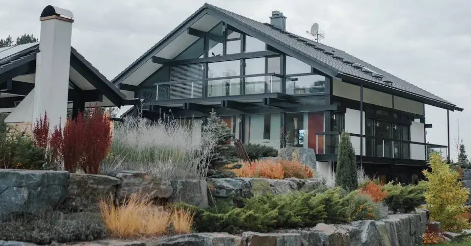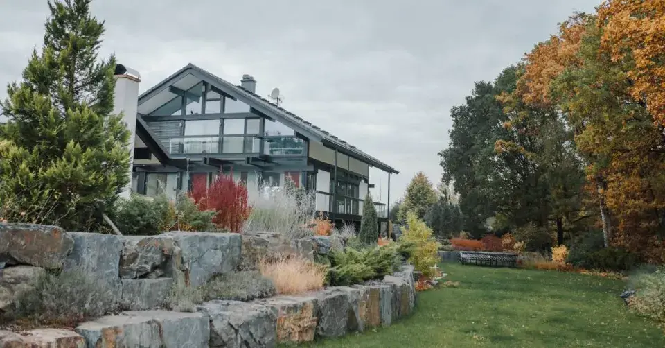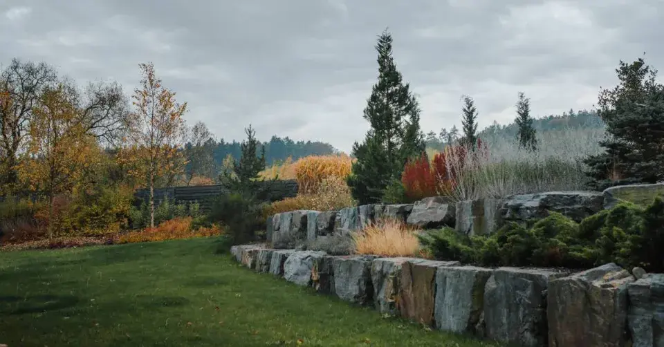 Zahrada se tak začala vytvářet souběžně s domem. Na podzim se na pozemek za pomoci jeřábu umístily obří kameny pocházející z kamenolomu ve Zbraslavi. Každý z nich váží zhruba 3,5 tuny a použity byly ke stavbě dvou kamenných stupňů, resp. zídek, které podpírají svah.