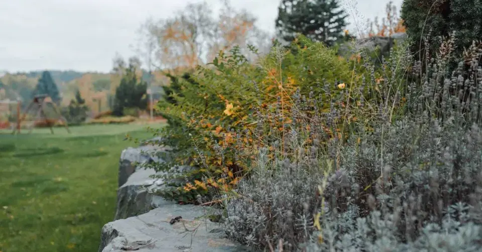 Za pozornost stojí rovněž bylinky, jako je levandule nebo mateřídouška, vysazené vedle terasy.