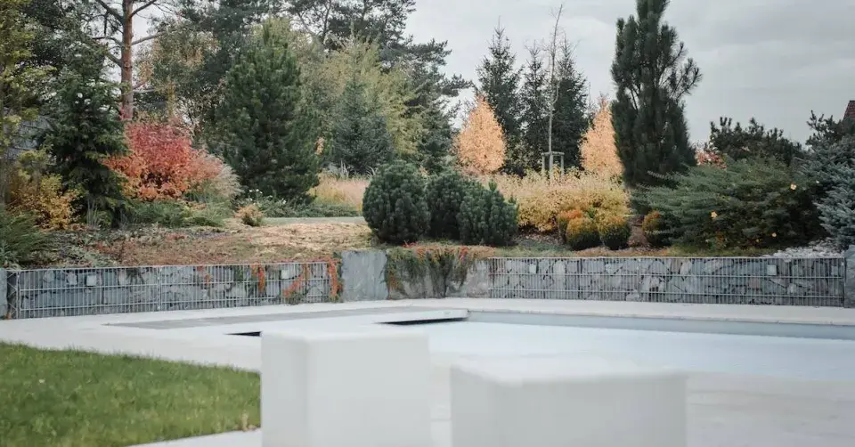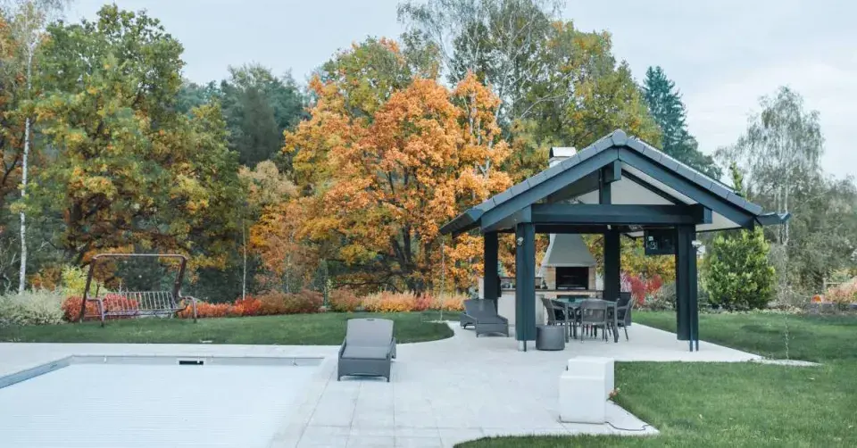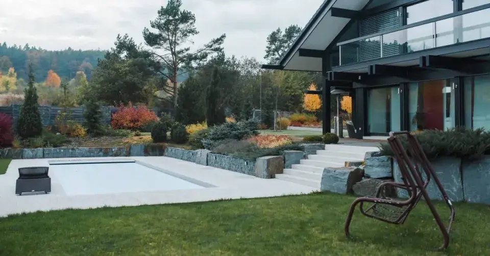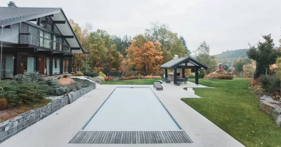 Na altán navazuje bazén hluboký 1,3 metru, který je možné zakrýt lamelovou roletou. K vydláždění okolní zpevněné plochy byl použit přírodní travertin. Podle majitelky je úžasný, protože není nikdy horký. Během letních večerů přispívá k příjemné atmosféře i zahradní osvětlení.