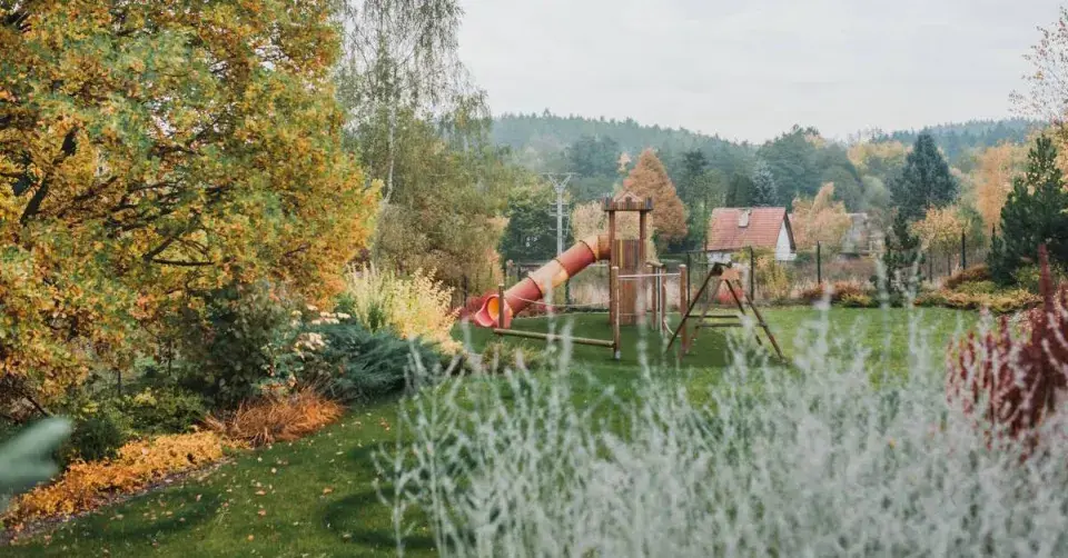 V zadní části zahrady mají pré hlavně děti. Kromě extra dlouhé a poměrně strmé skluzavky si tu mohou užívat houpačky, hrát si ve věži s krytou skluzavkou nebo trénovat balanc na dalších herních prvcích. K dispozici je jim i trampolína za domem.