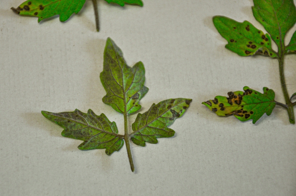 Na čepelích listů, postižených septoriovou skvrnitostí rajčat, vznikají drobné, kulaté skvrnky se světlým středem a tmavým okrajem