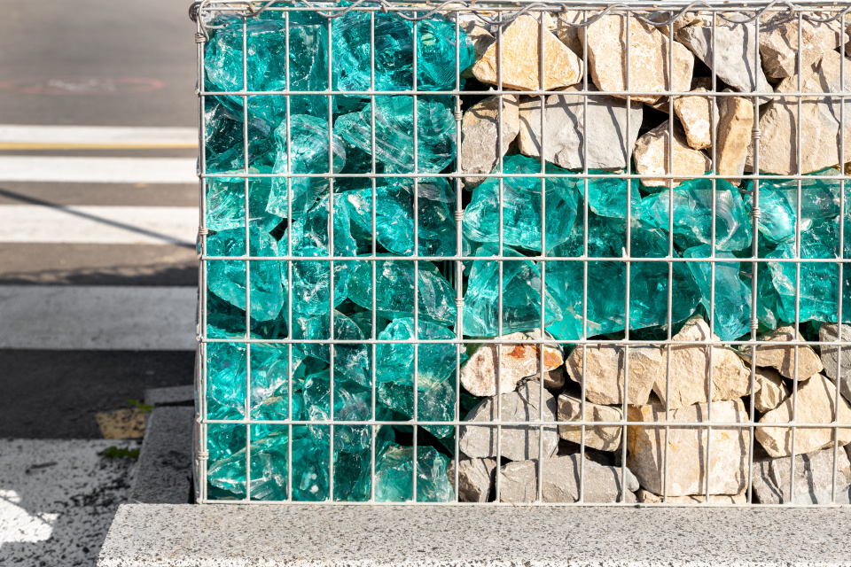 Pokud jste fanouškem výrazných barev v zahradě, můžete gabion naplnit modrým sklem. To zakoupíte stejně jako kameny ve vybraných obchodech s okrasným kamenivem.