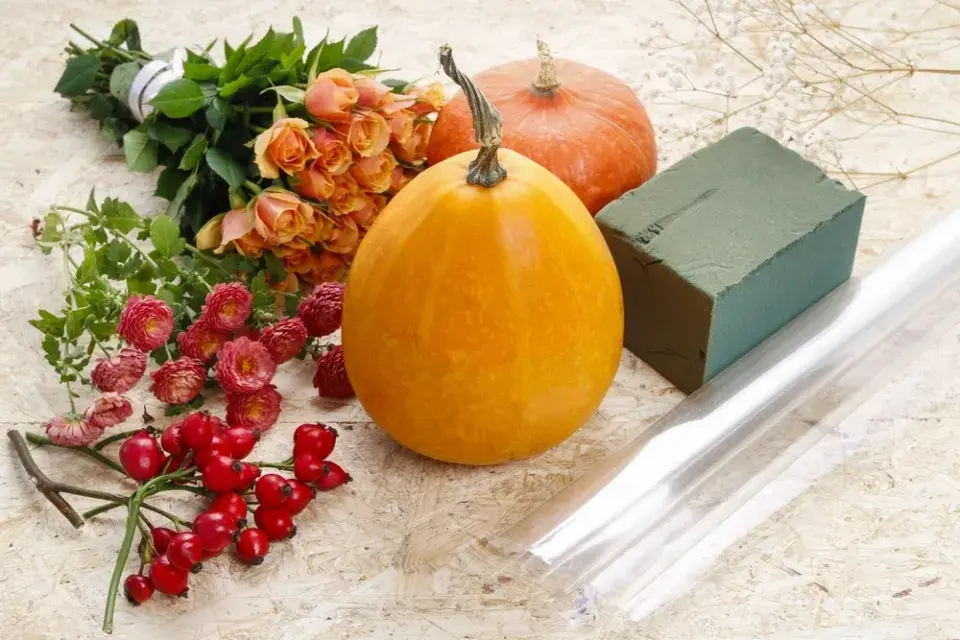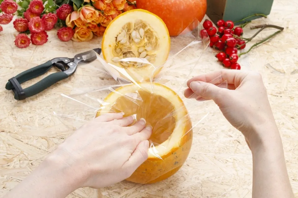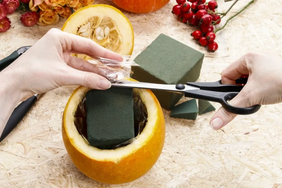 Aranžovací hmotu vložte do dýně, upravte podle její velikosti a důkladně namočte