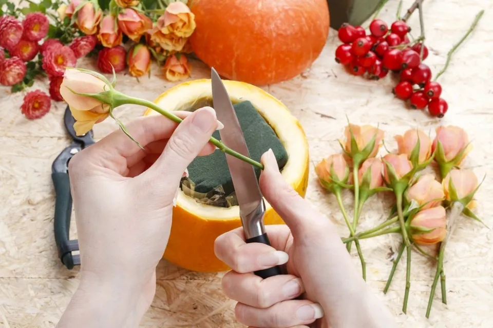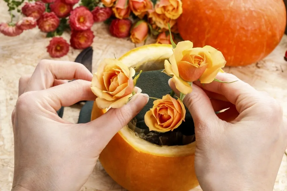 Zapomeňte na klasické vázy – tahle dekorace z čerstvých růží ukrytých v dýni si vás získá svou vůní i barvami