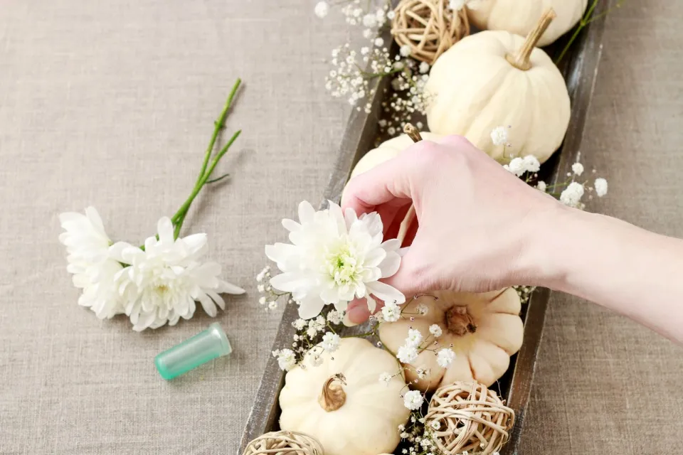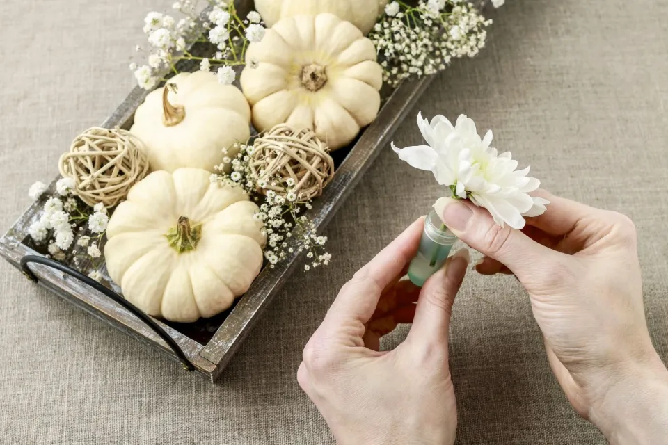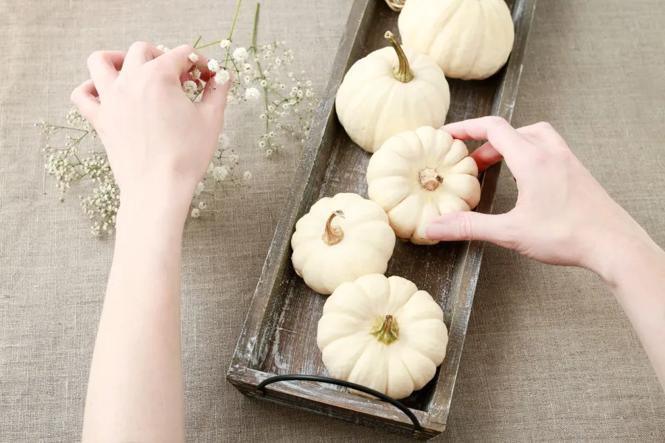 Na dřevěný tácek nainstalujte dýně a vsaďte do nich nevěstin závoj