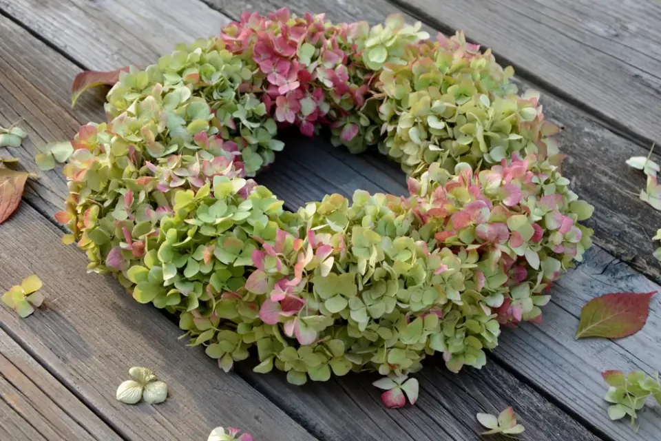 Dušičkový věnec můžete vytvořit z odkvetlého květenství hortenzií