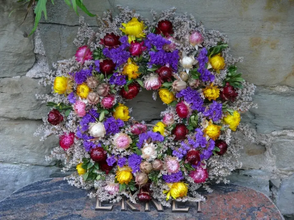 Dušičkový věnec ze sušených květů musíte na hrobě ochránit celofánem, jinak vám květy zničí vítr a déšť