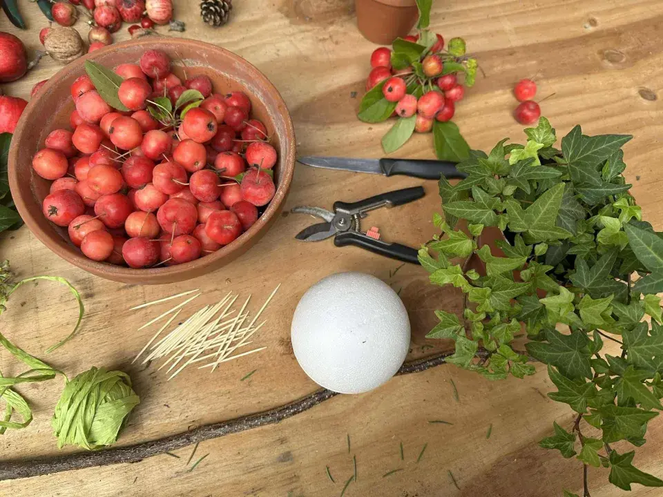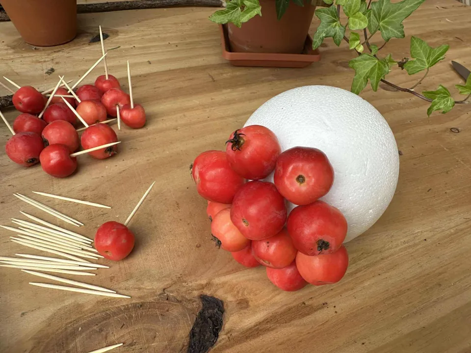 Jablíčka pomocí párátek zapichujte postupně do polystyrenové koule. Pokryjte co nejlépe celou plochu