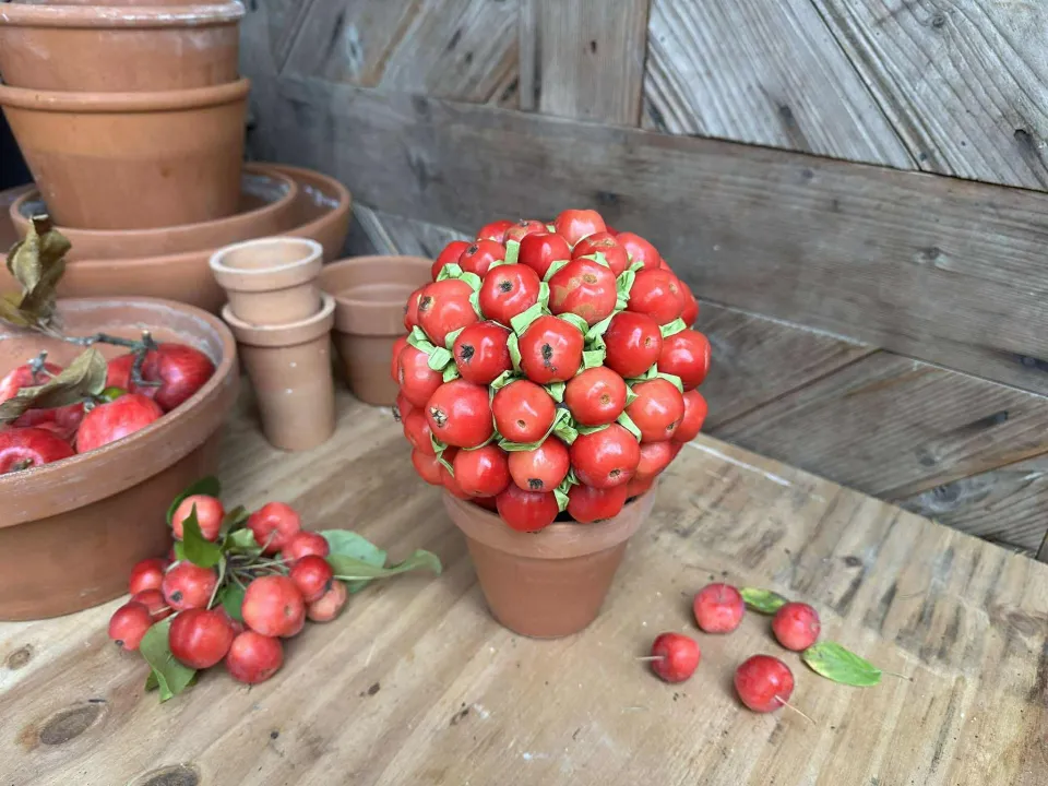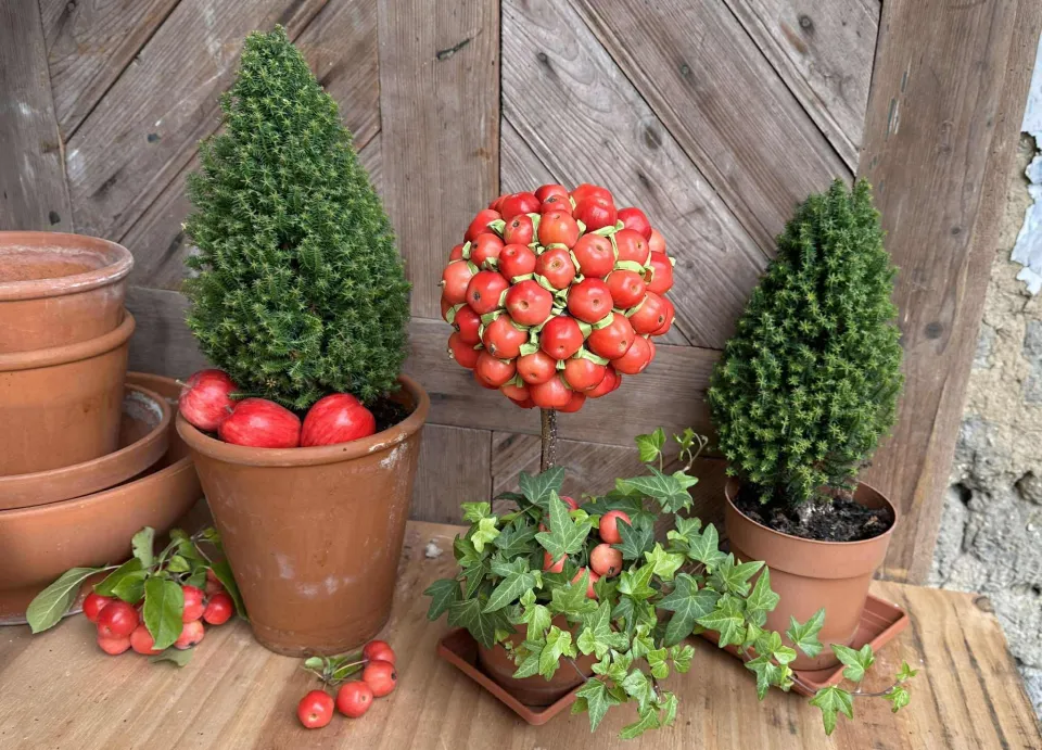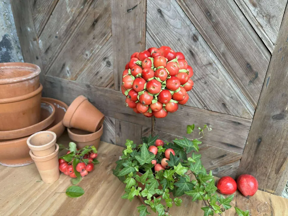 Hotovou kouli z jablíček zapíchněte do květináče s břečťanem a přidejte pár jablíček na dozdobení celé dekorace