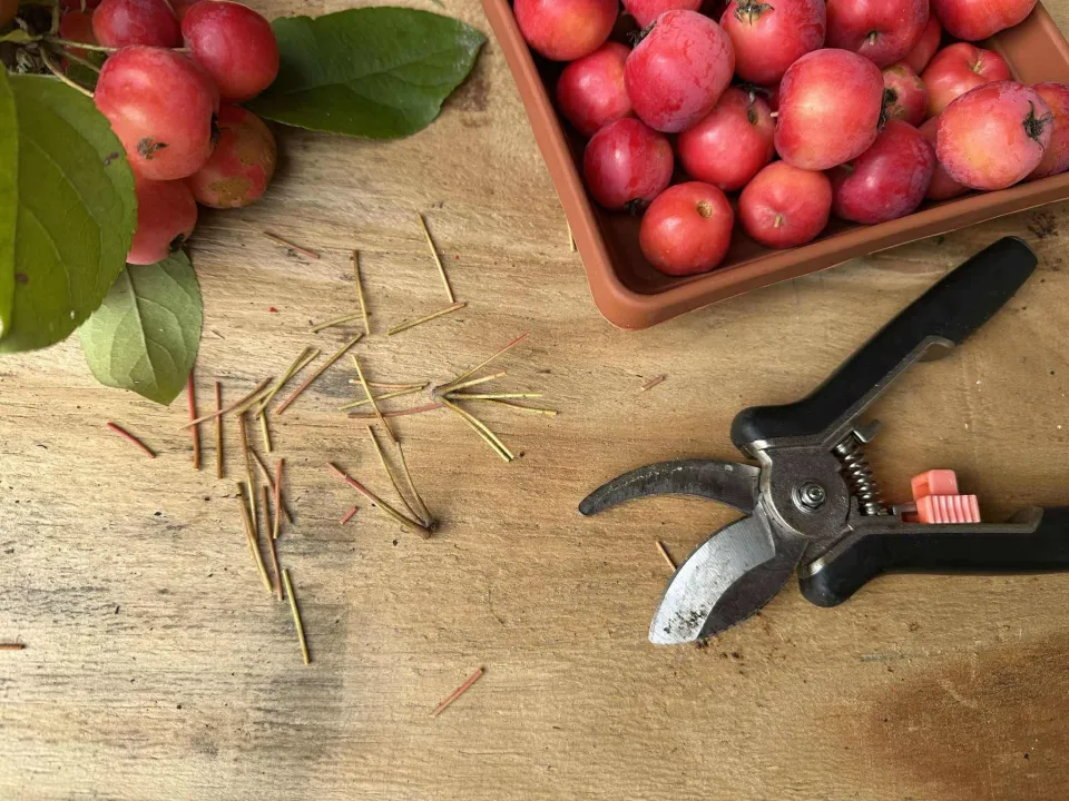Nyní si připravte větší množství miniaturních jablíček a z každého plodu odstřihněte stopku. Stopky jsou sice velmi tenké, vypadají jak od třešní, ale velmi špatně se jen tak odtrhávají. S nůžkami to půjde mnohem lépe