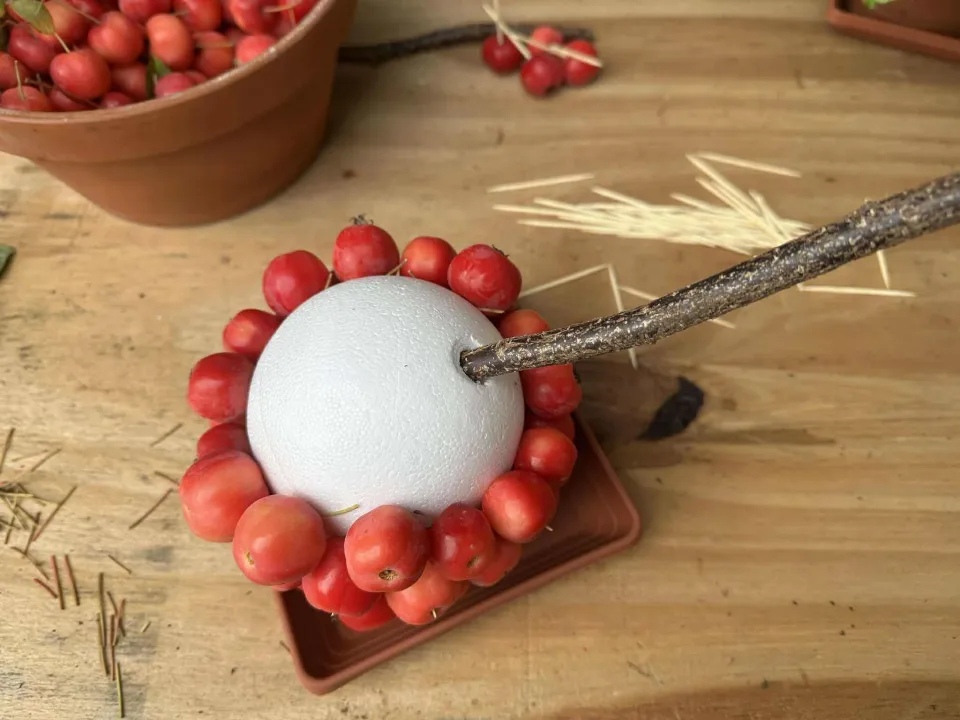 Ještě, než jablíčka zapícháte do celé plochy koule, napíchněte kouli na zašpičatělou větvičku