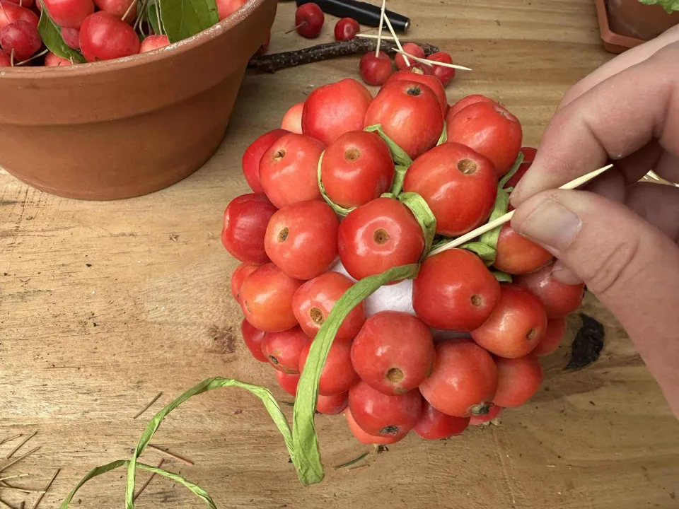 Místa mezi jablíčky, na kterých prosvítá bílý polystyren, vyplňte zeleným lýkovým provázkem. Vytvářejte volné smyčky a zapichujte je do polystyrenu párátkem. Jde to velmi snadno