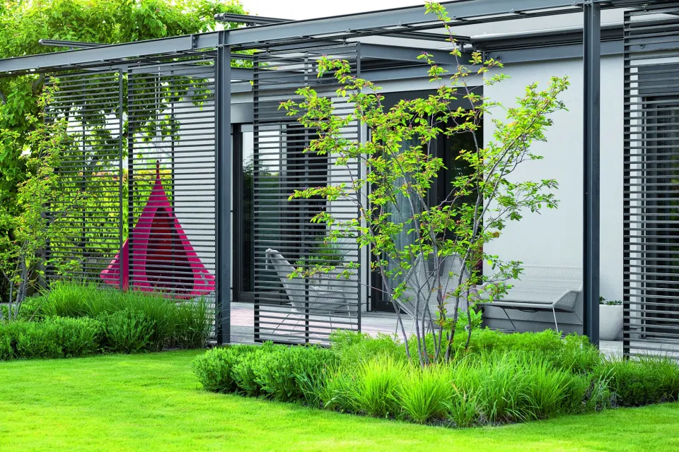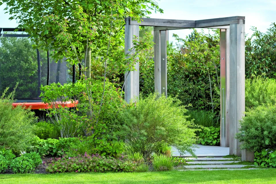 Geometrie masivních dřevěných trámů se záměrně opakuje na několika místech v zahradě. Spolu s korunami stromů dodávají zahradě celistvost a jednotu