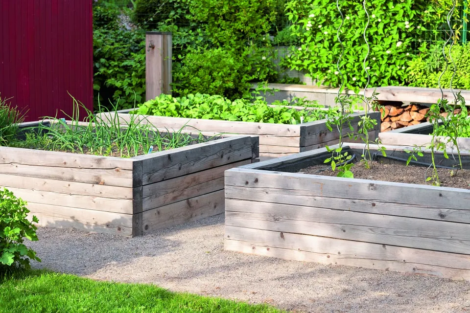 Fortelná práce Vyvýšené záhony jsou z dubového dřeva, stejně jako tělocvičné prvky