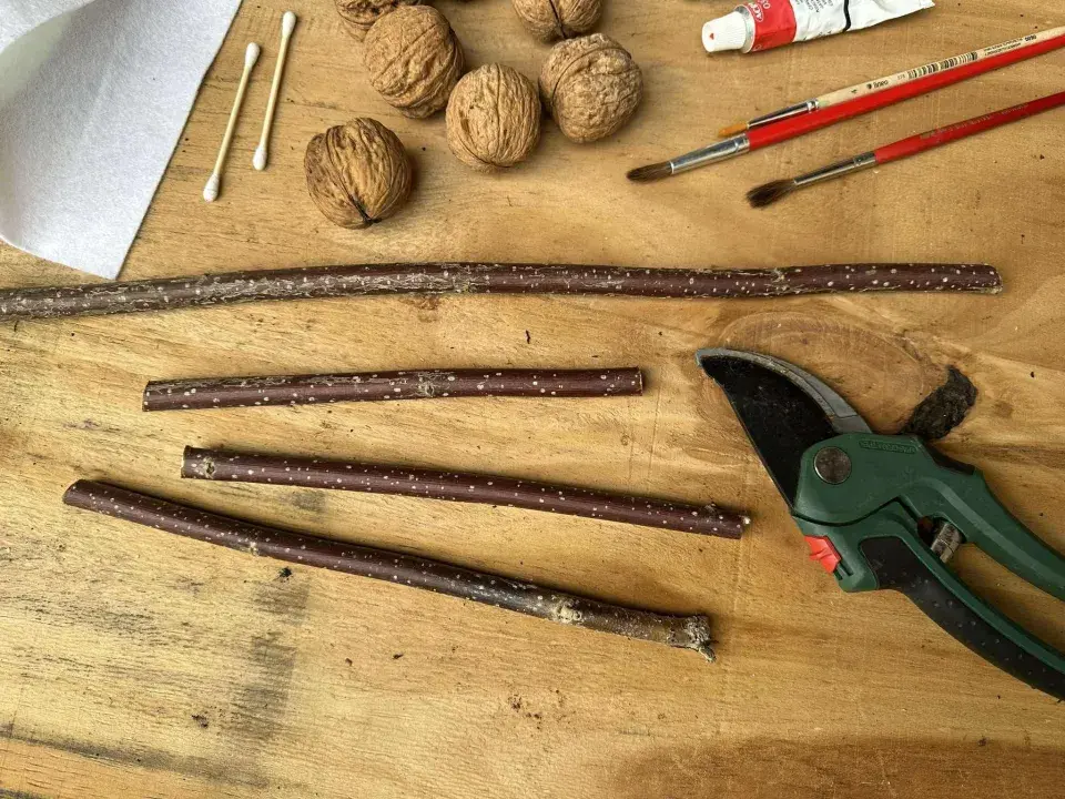 Nejprve si s pomocí zahradních nůžek nastříhejte suché větve na délku asi 20-25. Nejvhodnější budou například větvičky z ovocných dřevin, které mají hladkou kůru