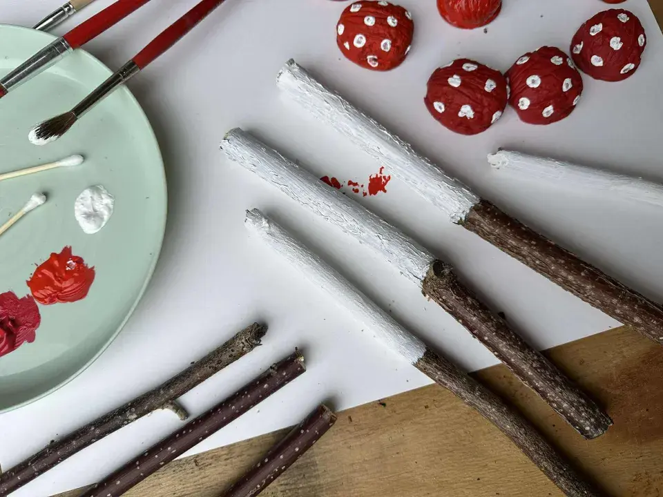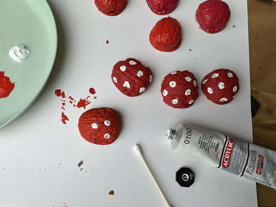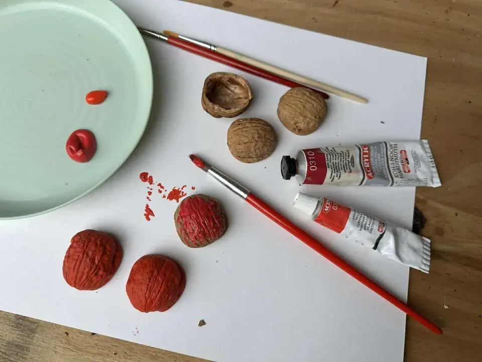 Rozpůlené skořápky ořechů natřete červenou akrylovou barvou