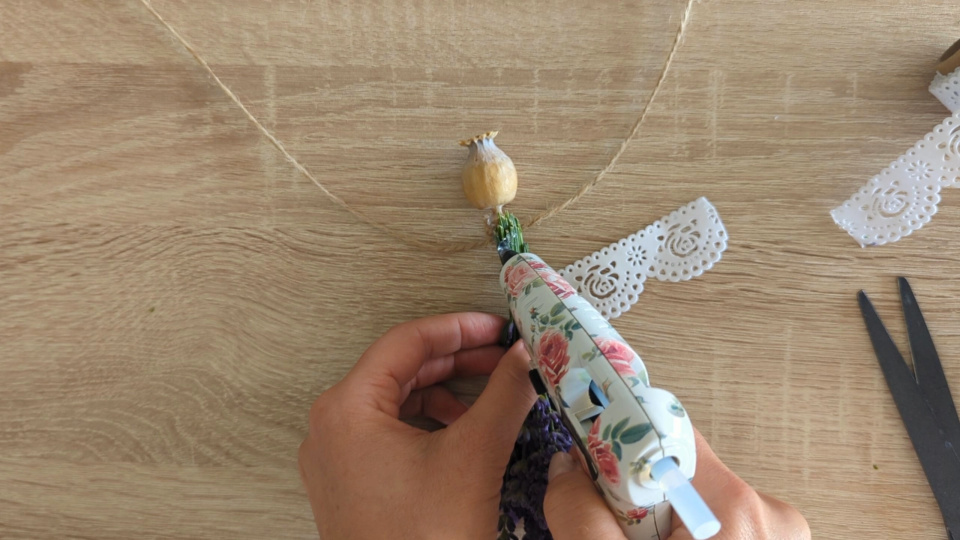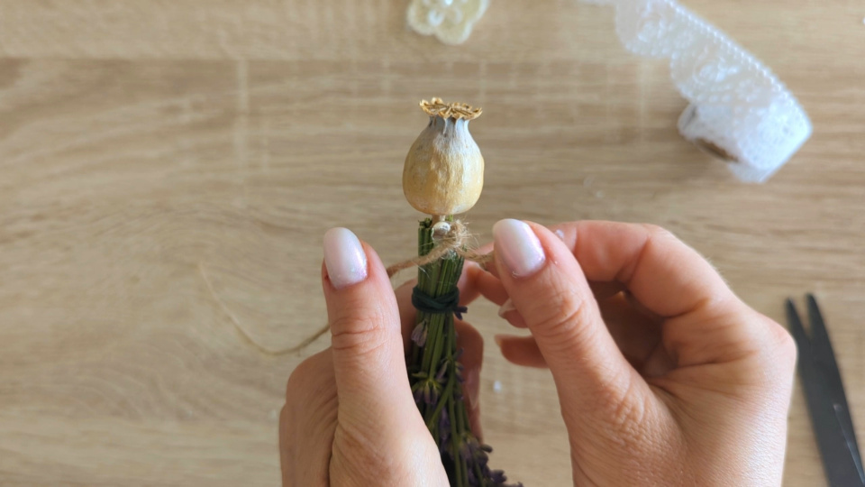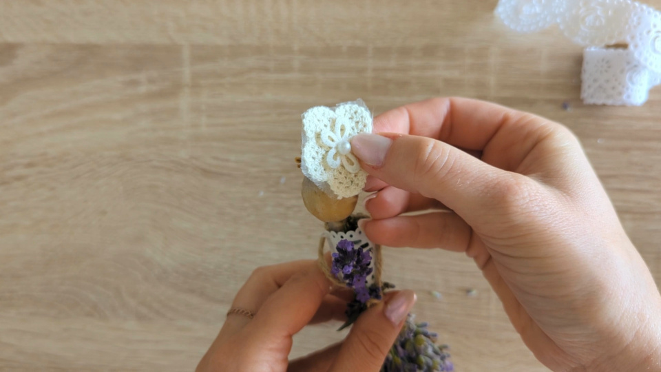 Panenku „oblékněte“ do stuhy. Z rukou vytvořte uzel a vložte do něj levanduli, potom ruce zkraťte.