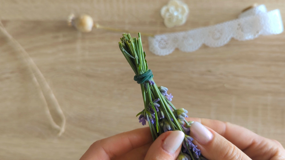 Svazek levandule zagumičkujte a stonky ostříhejte lehce do špičky.