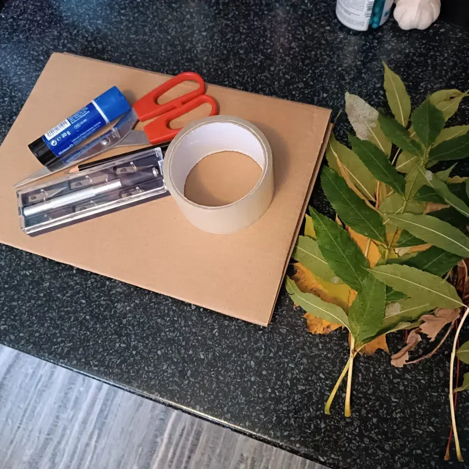 K tvoření si připravte lepenku, nůžky, řezák, tužku, lepící pásku a listy