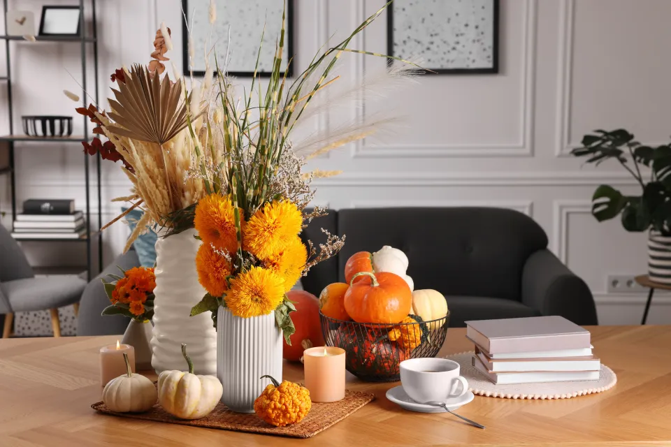 Tóny země, zlaté odlesky a měkké struktury vytvářejí hřejivou podzimní náladu. Stačí jediná kytice a prostor okamžitě ožije.