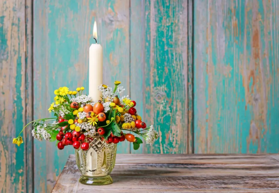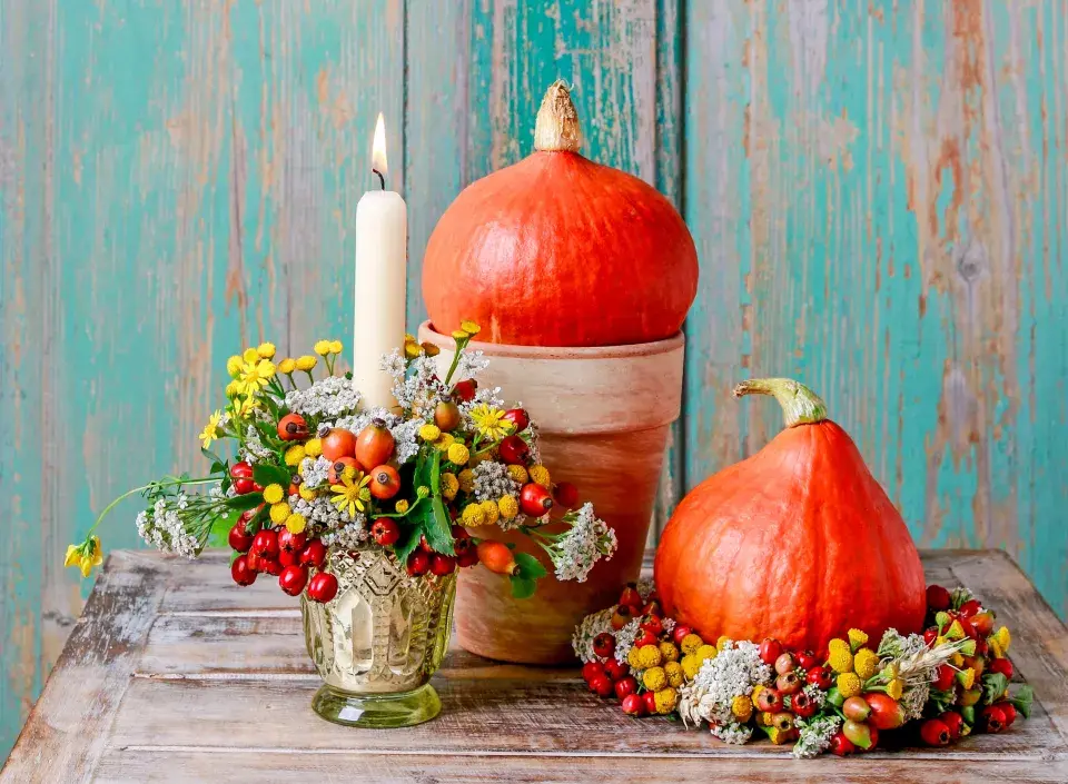 Ze stejných rostlin jako svícen snadno vytvořte i věneček, do kterého pak posadíte pěkně vybarvenou menší dýni