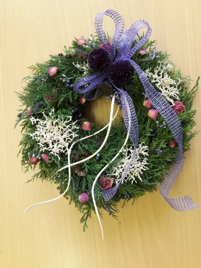 Dušičkový věnec musí být hlavně ozeleněný větvičkami z jehličnanů nebo stálezelených dřevin, případné dekorace přichází na řadu až později