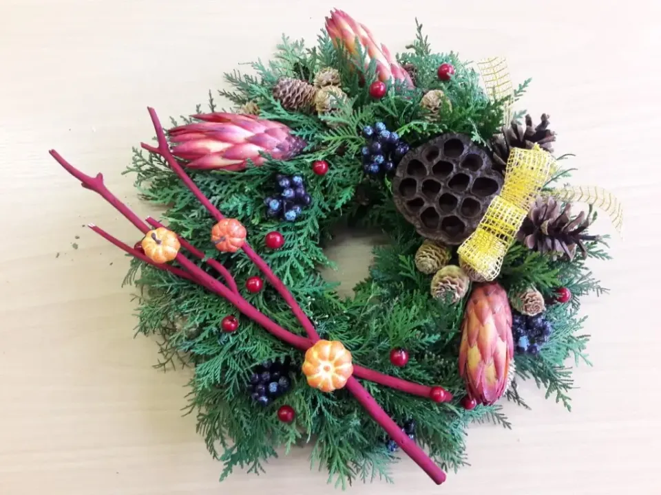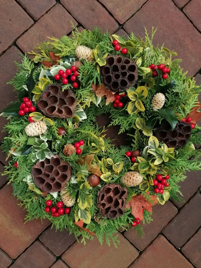 Na dušičkový věnec lze využít různé šišky, lesní plody nebo sušené rostliny