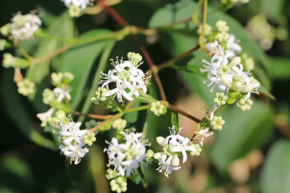 Květy sedmisynu jsou drobné, krémově bílé, uspořádané do nápadných lat