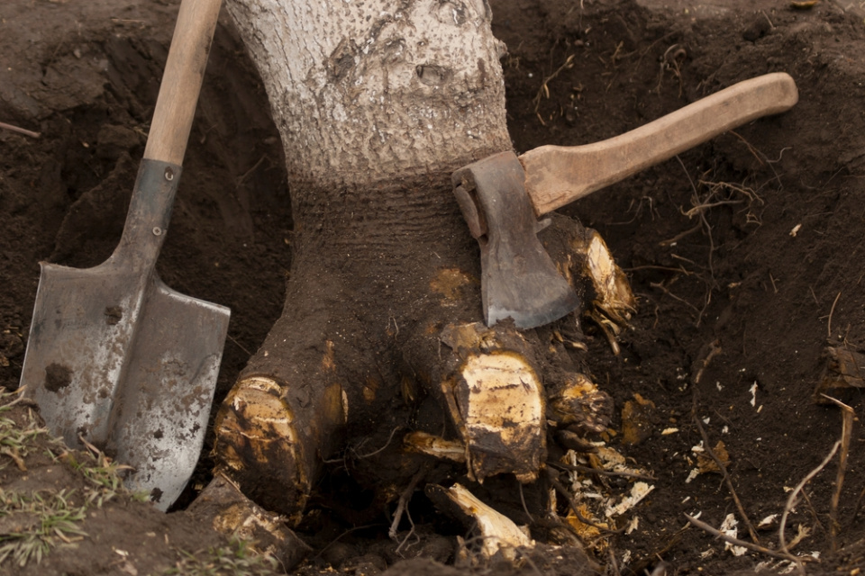 Pro mechanické odstranění pařezu potřebujete lopatu, rýč, někdy krumpáč a hlavně sekeru či motorovou pilu