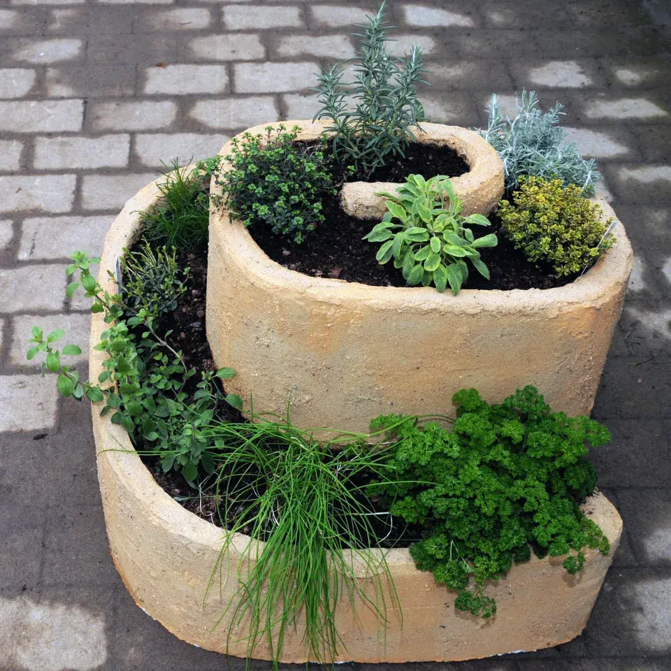 Miniaturní bylinková spirála v podobě květináče. Vystačí alespoň pro základní bylinky a je ideální do malé zahrady nebo na balkon či terasu.