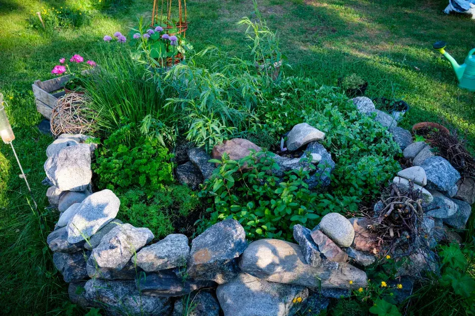 Kvetoucí bylinková spirála: některé bylinky ponechte bez stříhání, ozdobí tak vaši zahradu nejen svým vzhledem, ale i květem bylin. Stěny poslepované z kamení se perfektně hodí do přírodních zahrad.