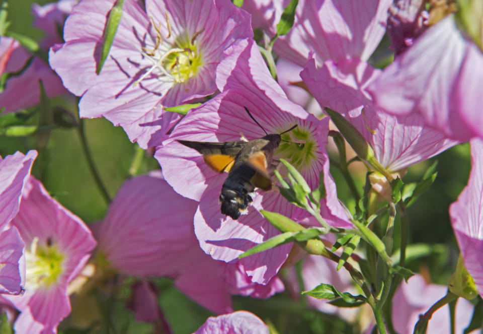 Noční motýli, dlouhozobky svízelové, zanoří svůj dlouhý sosák do květu pupalky nádherné, chvíli se na ní bezmocně zmítají, a pak vysílením uhynou