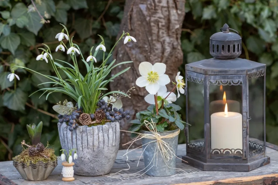 Rychlené sněženky a nádherná čemeřice jako doplněk vánočního svícnu