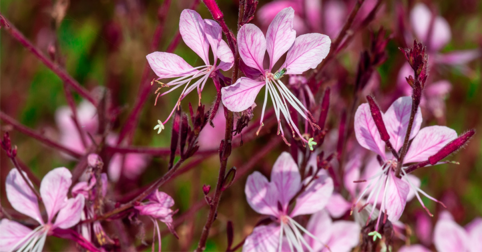 Svíčkovec neboli Gaura má zajímavě zbarvené i listy, které spolu s květy vytváří příjemný kontrast