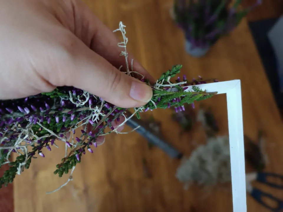 Rámeček z vřesu vytvoříte tak, že k němu snítky vřesu jednoduše přidrátkujete