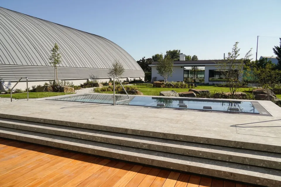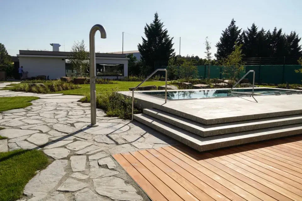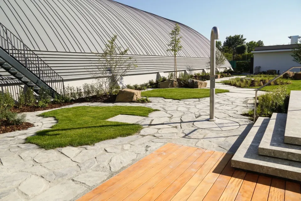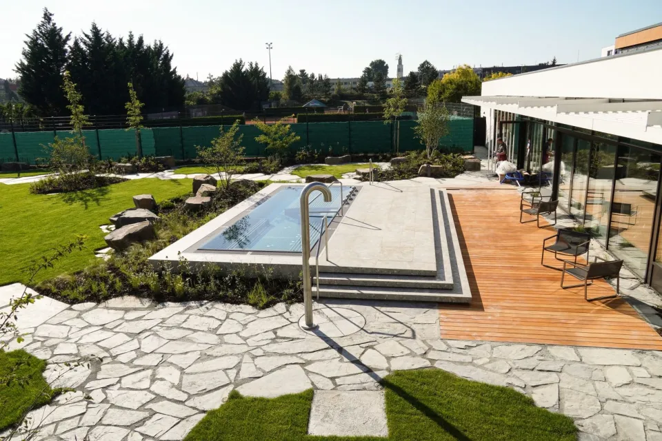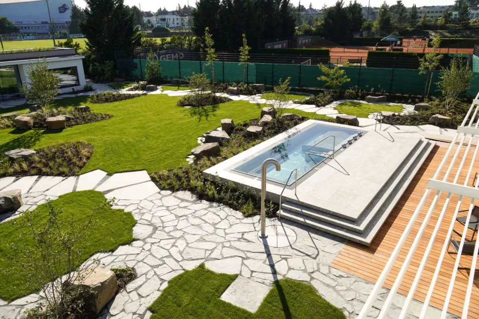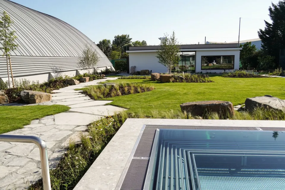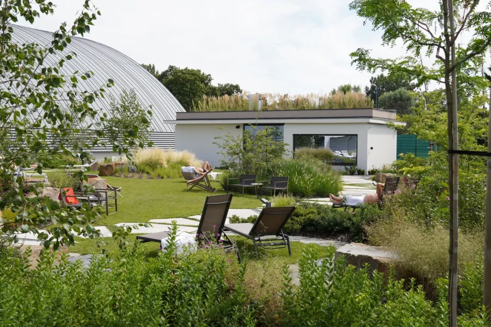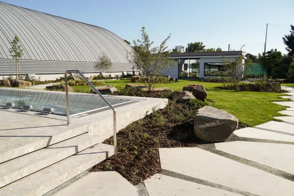 Vedle venkovního bazénu wellness centra vás čekají travnaté zálivy s keři, trvalkami a travinami, nebo nenápadná místa k posezení na kamenech