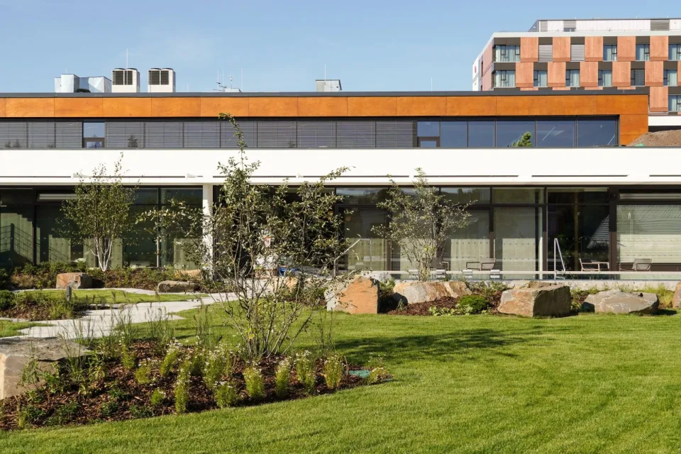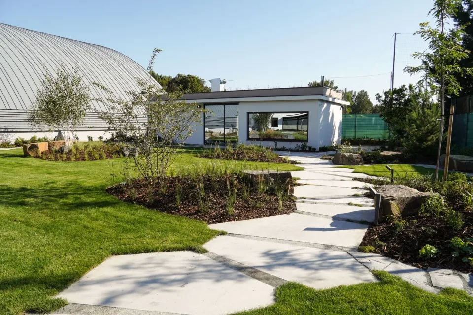 K moderní architektuře wellness centra OMEGA vzniklo okolní prostředí, které doplňuje styl budovy a nabízí hostům přirozený klid