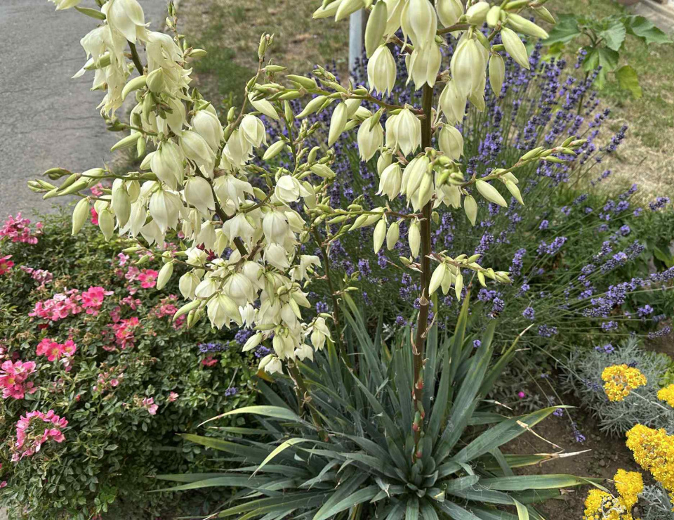 Ústřední dominantou nenáročného trvalkového záhonu je rozložitá rostlina s mečovitými listy, juka vláknitá