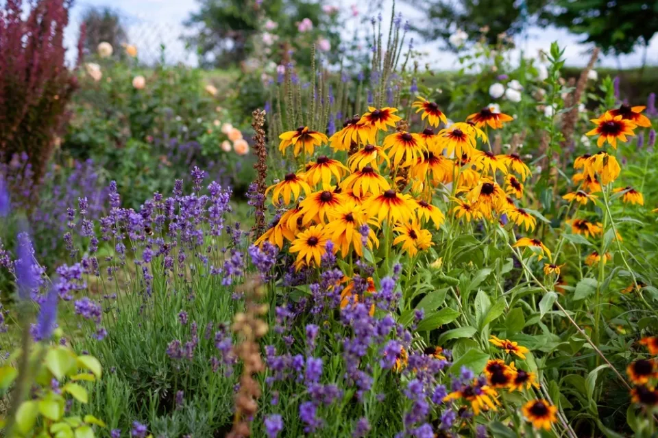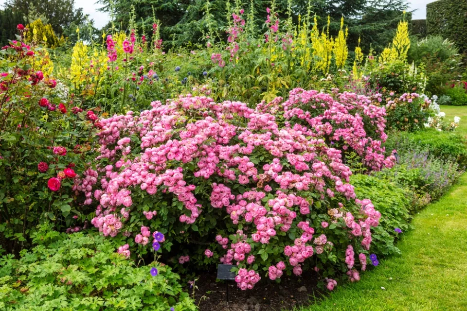 I růžím se v bohatých trvalkových záhonech může dobře dařit