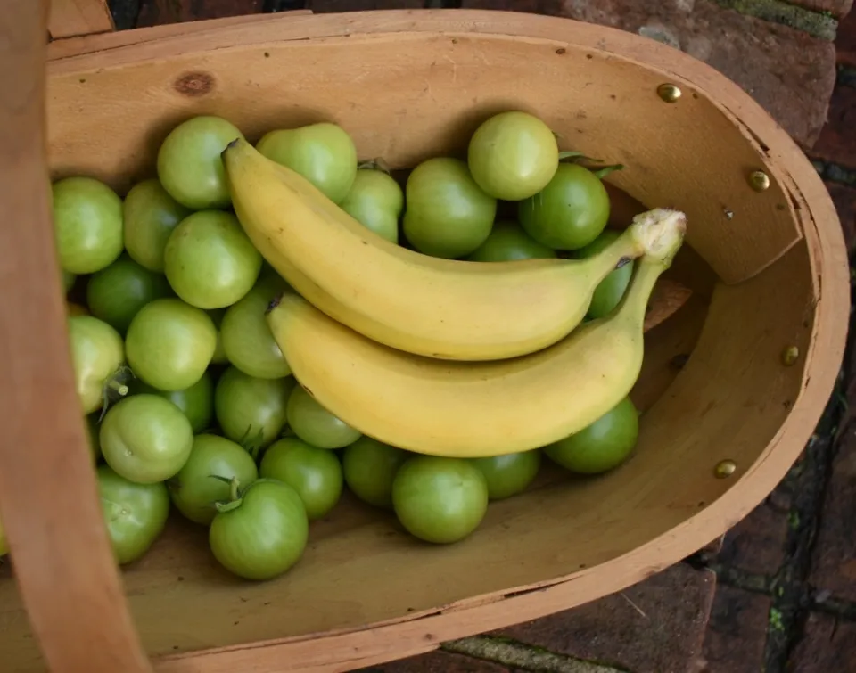 Uložte zelená rajčata do mísy a přidejte k nim banán nebo jablko. Rajčata rychleji dozrají