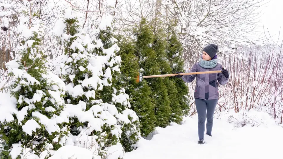 Péče o túje v zimě spočívá také v sestřásání těžkého sněhu z větví