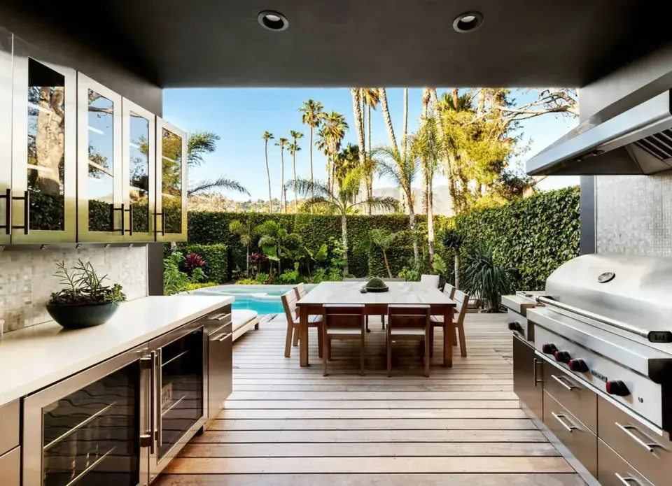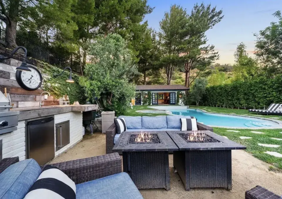Nick Cannon si pořídil venkovní kuchyni přímo u ohniště s výhledem na zahradu. Jeho dům je skvělým zdrojem zahradní inspirace pro propojení vaření a relaxace.