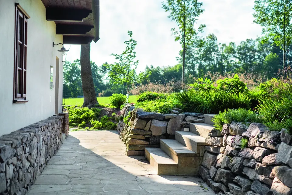 Zídkou ze stejného materiálu jako podezdívka domu procházejí pohodlné schody
