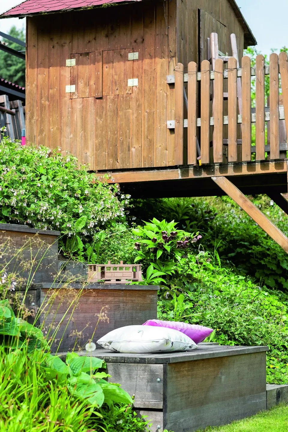 Pohodlné schodiště k vyvýšená části má smysl: jinak by domácí na travnatý plácek na kopci časem přestali chodit