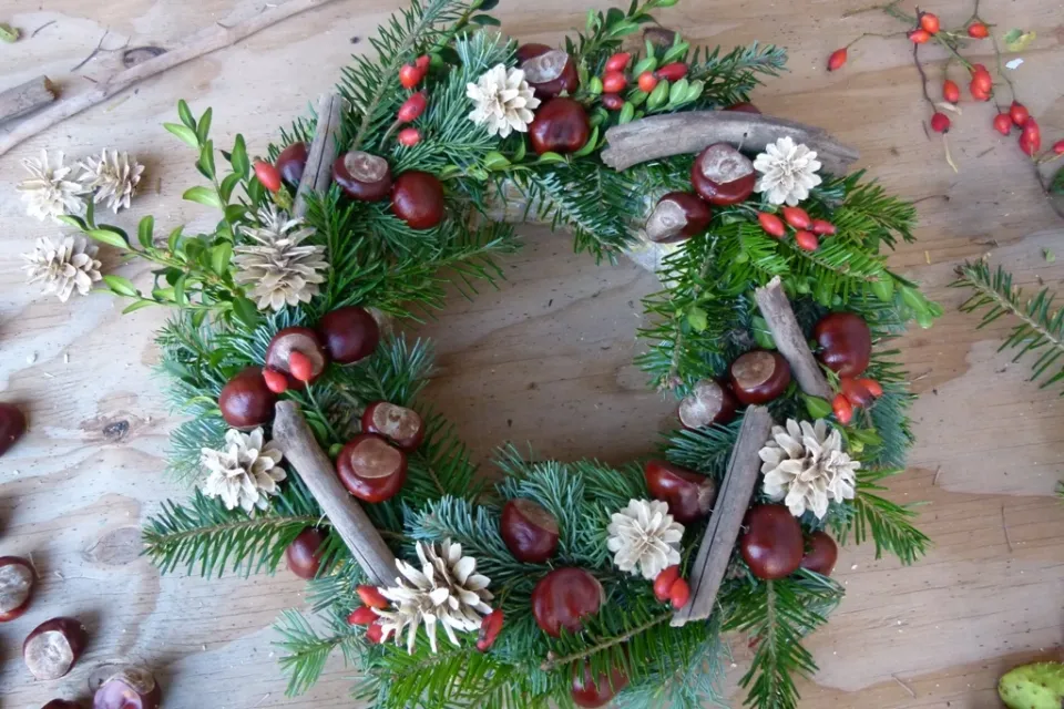 Věnec s kaštany a bělenými šiškami