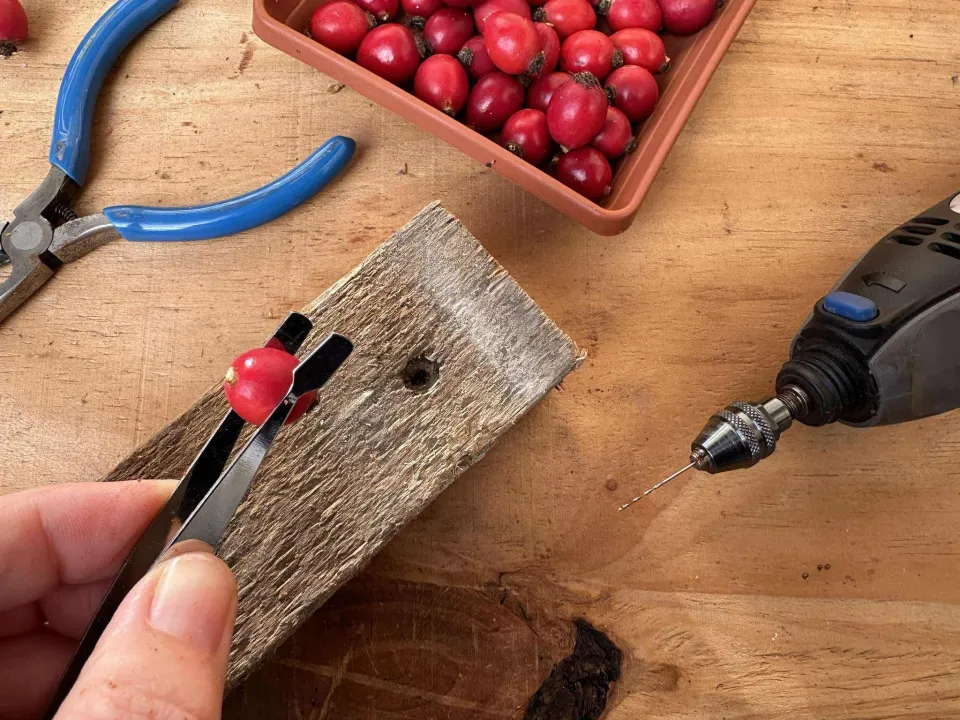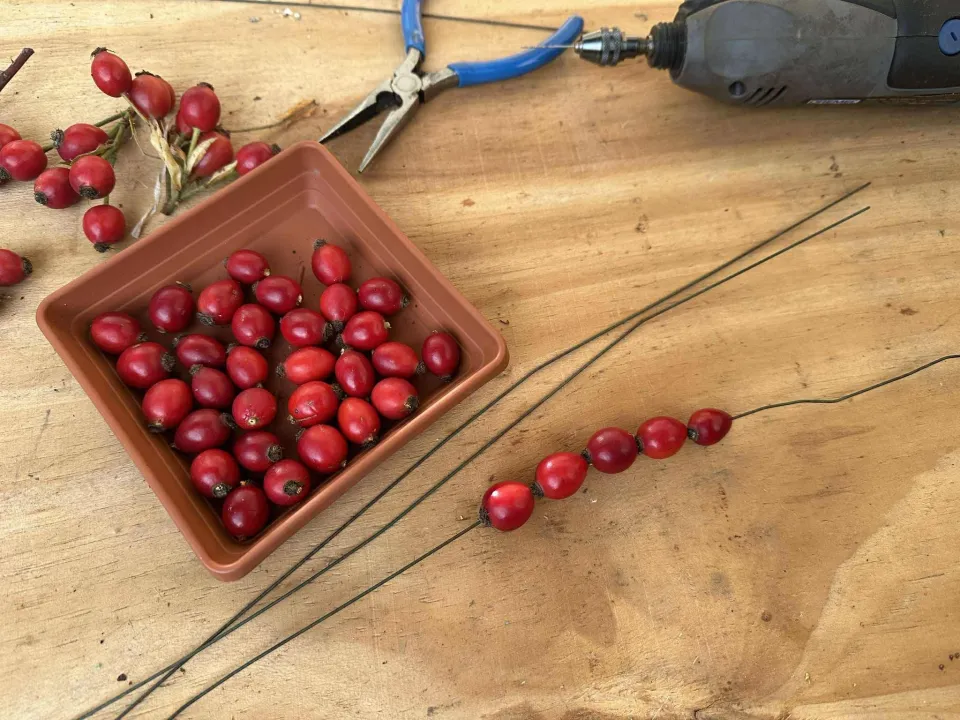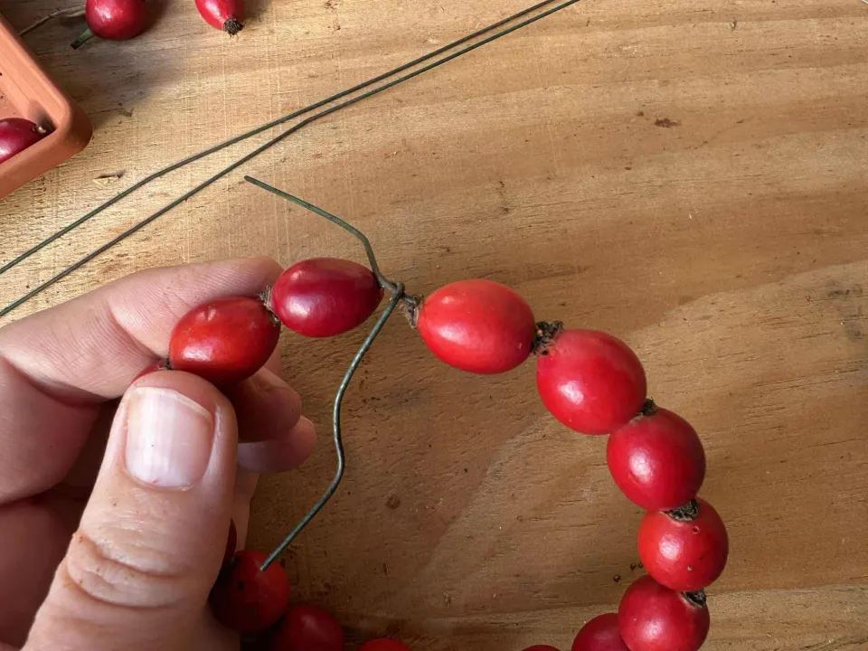 Navlékněte asi 16-18 šípků, drátek stočte do kruhu a omotáním drátku kruh uzavřete